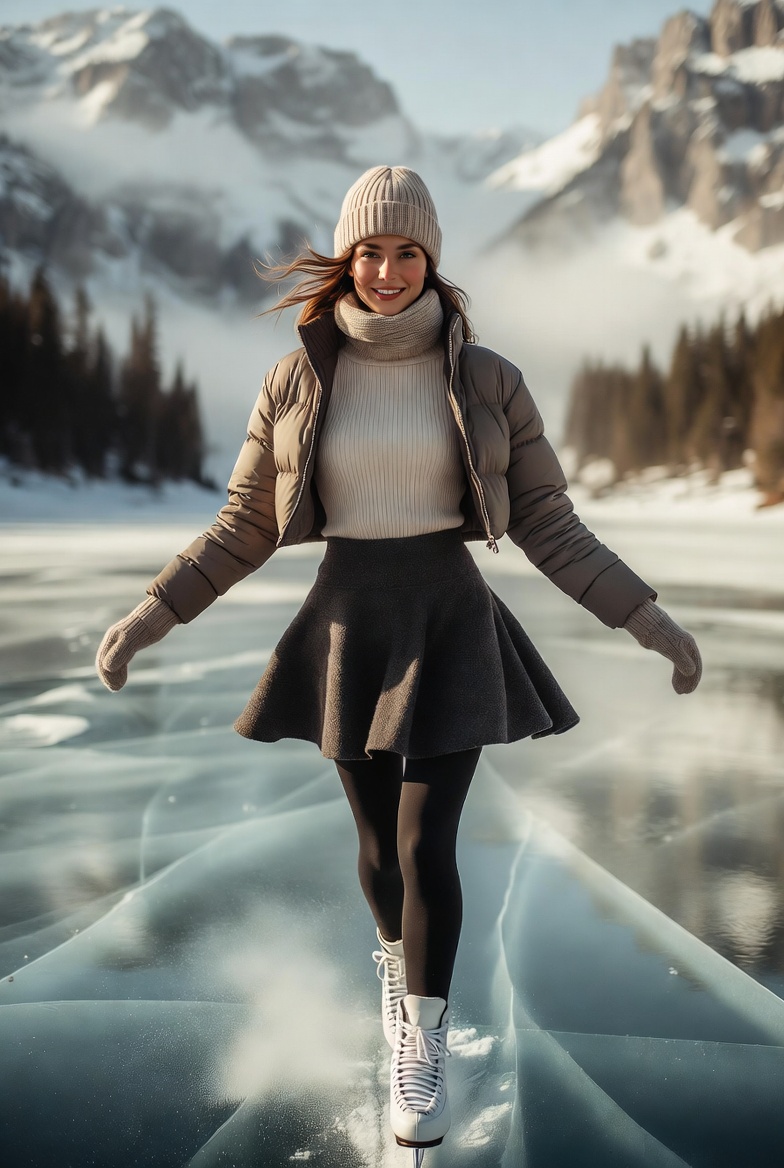 The subject is a stunning young woman captured mid-glide on the lake, skating with confident ease rather than performing a showy spin. The pose is dynamic but believable: a gentle crossover stride, arms slightly out for balance, scarf tails lifting in the breeze, and a relaxed smile that reads like she’s actually enjoying the cold. That moment movement without chaos is the sweet spot for photorealism. You get energy in the frame (ice dust, motion in hair, scarf flutter), but the image remains sharp and editorial, like a luxury travel campaign caught in a candid second.