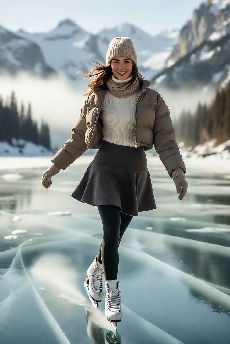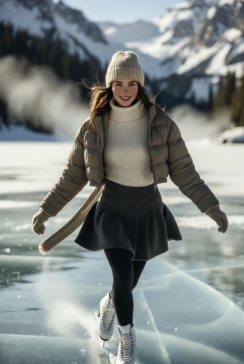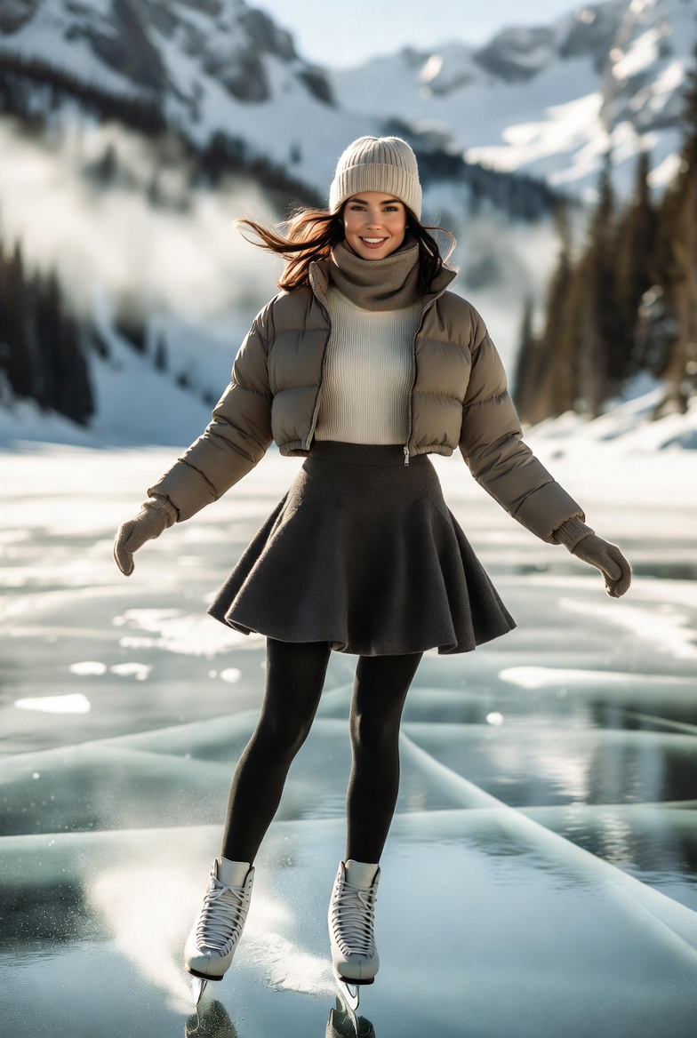 Her outfit is winter-cute with real-world logic, built around a flattering skirt silhouette that still looks warm. Think a fitted ribbed turtleneck tucked into a high-waisted wool skater skirt, paired with opaque thermal tights and classic white figure skates. A cropped puffer or a tailored short wool coat adds structure and keeps proportions modern, while knit gloves and a soft beanie make the scene feel authentically cold. Textures do the heavy lifting: wool weave, ribbed knit lines, matte tights sheen, and the clean leather of skates against roughened ice. The mountains stay present but not distracting peaks softened by atmospheric haze, pine treeline blurred into bokeh so the viewer’s attention stays on her expression and the motion of the glide.