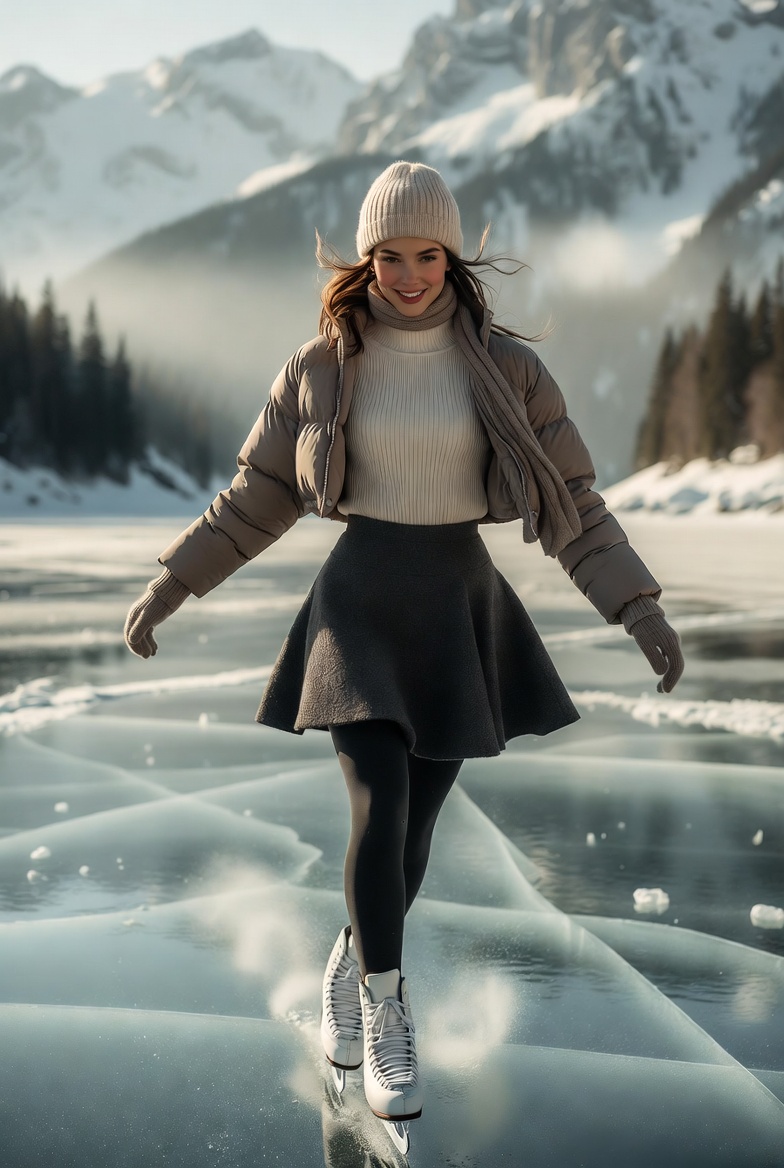 The 35mm lens choice keeps the environment epic without distorting the subject perfect for a natural lake where the mountains are part of the story. A slightly low angle makes the ice feel expansive and turns skate marks into leading lines, guiding attention straight to her face. The outfit’s textures (rib knit, wool skirt, opaque tights) translate beautifully in crisp daylight, while the Portra-style look keeps skin tones warm and lifelike even under cool alpine sun. The reflections and micro-details on the ice act as photoreal “proof,” making the scene feel tangible rather than rendered.