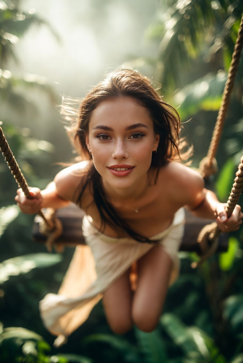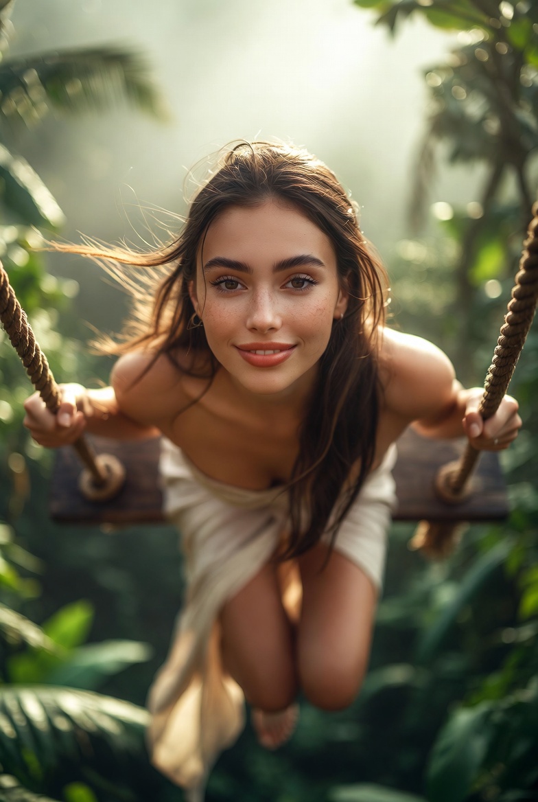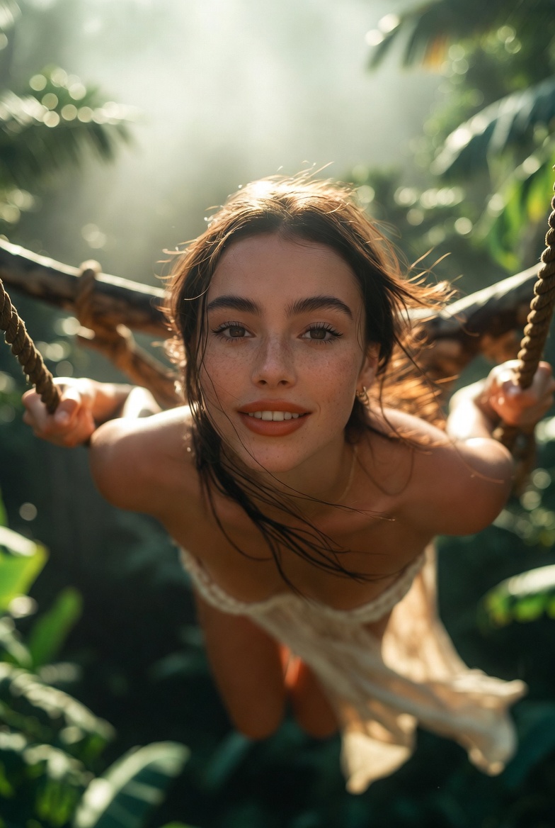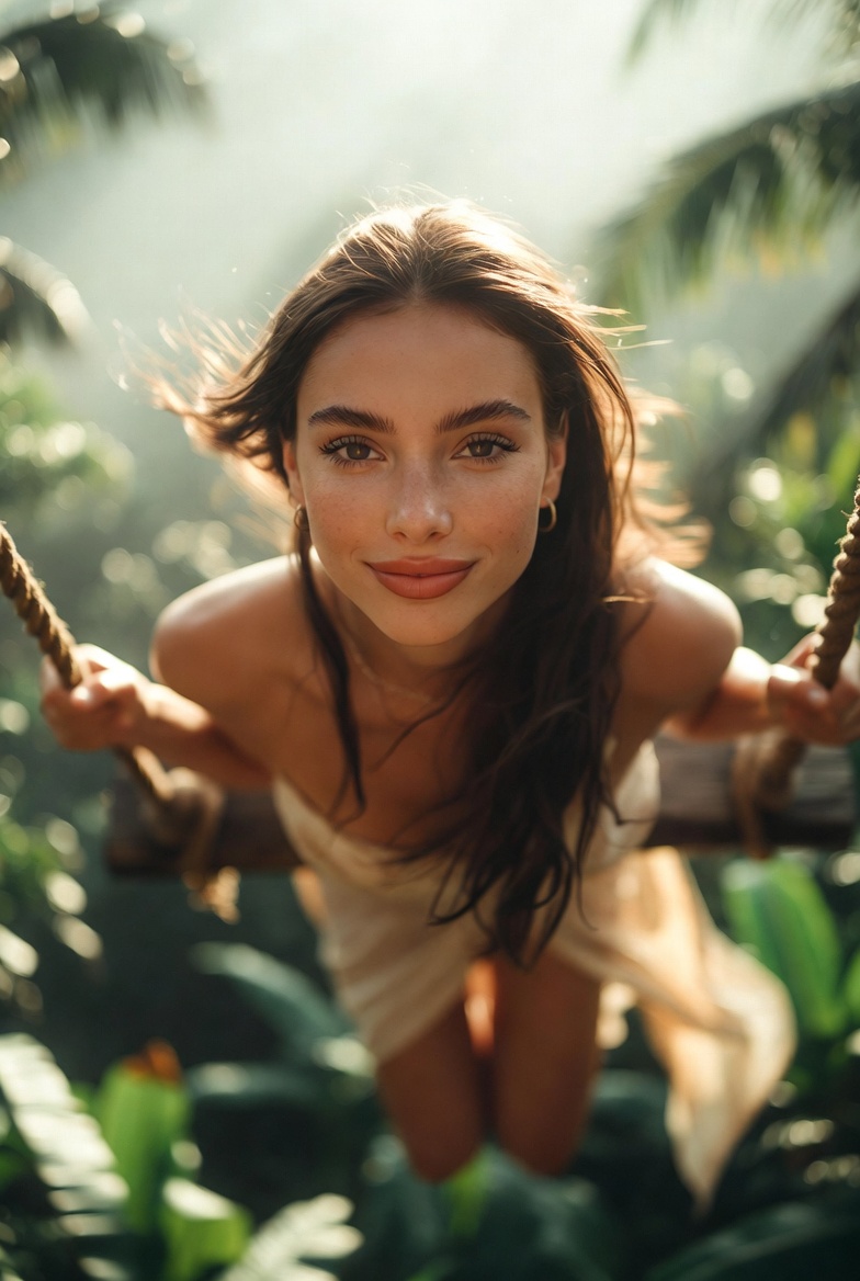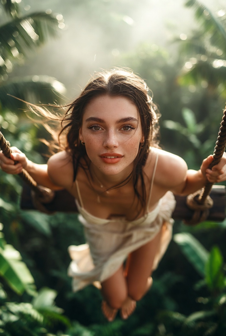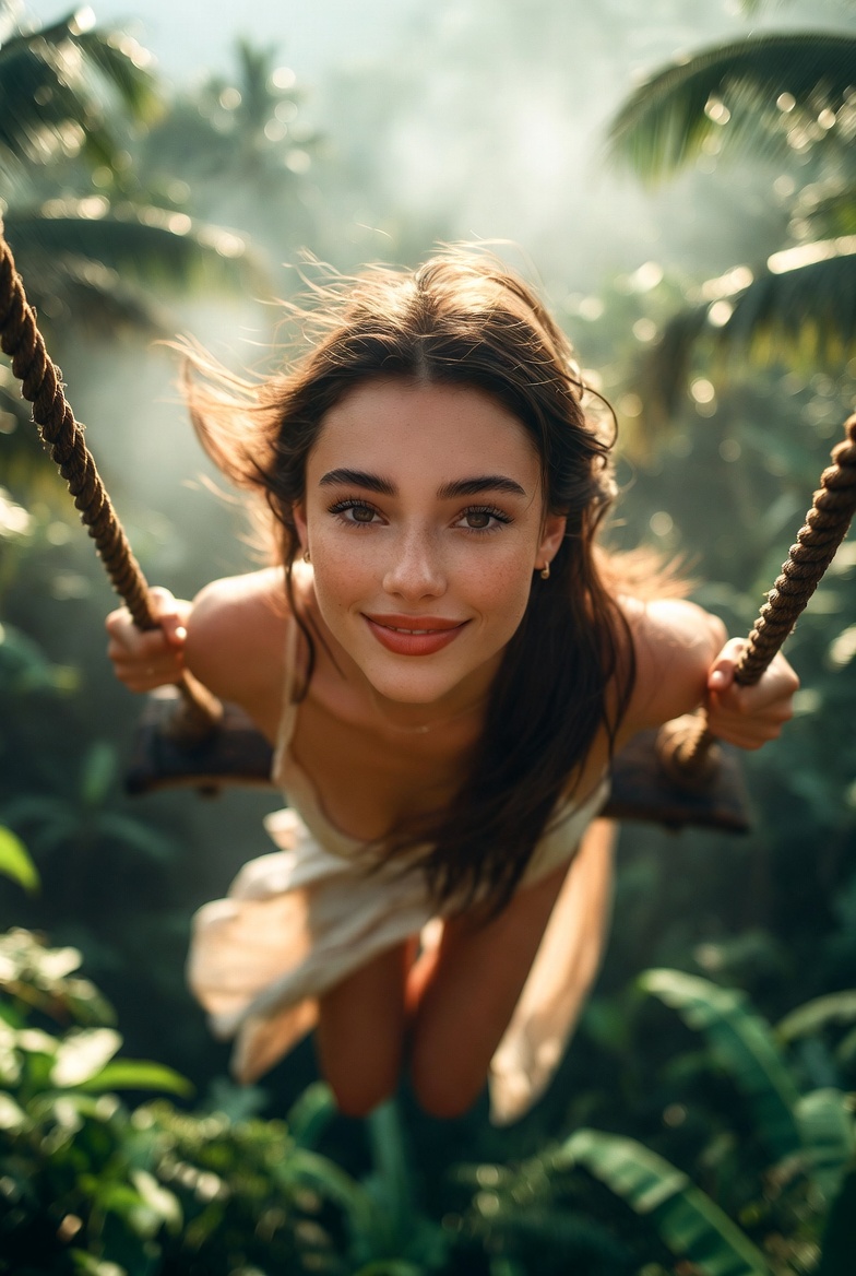 For composition, a gentle worm’s-eye low angle from slightly below the swing line makes her look powerful and tall while emphasizing the canopy drop and the cinematic scale of the jungle. The background should layer into soft bokeh banana leaves, palm fronds, distant mist while the subject stays tack sharp: eyes, rope fibers, and fabric weave crisp enough to feel touchable. Done right, it looks like a travel film still: effortless, luminous, and undeniably real.