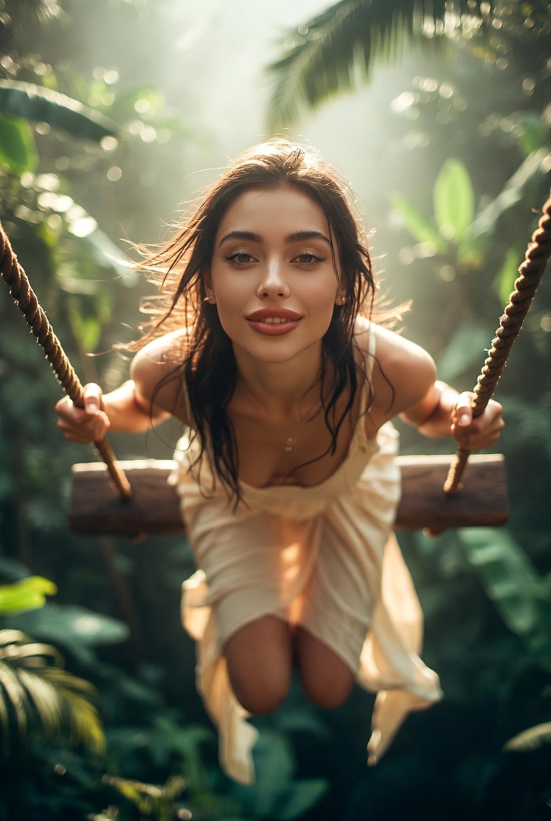 Wardrobe should match the location and the physics. A long flowing dress is perfect because it “draws” motion: fabric trails behind her, folds ripple at the hem, and highlights roll across the material in a way that instantly reads expensive and real. Choose a color that sings against green without clashing soft ivory, warm terracotta, or deep coral so the silhouette pops while still feeling natural in a tropical environment. Keep it tasteful and elegant: a defined waist, a clean neckline, and lightweight fabric that moves easily. Add small, believable accessories delicate hoops, a thin necklace, maybe a simple bracelet so nothing competes with the movement. Bare feet or minimal sandals keep the scene authentic for a swing platform, and tiny details like dust on the swing seat or faint pollen specks in the air can elevate realism without making anything look messy.