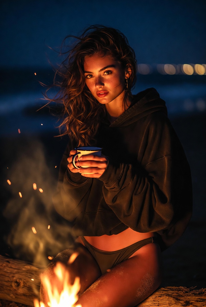 The outfit is intentionally “beach-night practical” with a fashion edge. An oversized hoodie (charcoal, washed black, or deep ocean blue) gives cozy volume and movement in the wind, with sleeves slightly covering her hands so it feels lived-in. Underneath, high-waisted bikini bottoms keep it believable for a beach setting styled as normal swimwear, not a costume and the high waist balances the oversized top for a clean silhouette. Add subtle details that boost realism: a small hoop earring glinting in the firelight, a thin anklet catching sparks of light when she shifts, and damp, salt-air texture in her hair from earlier in the day. The firelight does the rest, painting her cheekbones and hoodie fabric with warm gradients while the background falls into moody bokeh distant shoreline lights, a faint outline of friends far behind, and the ocean disappearing into black.