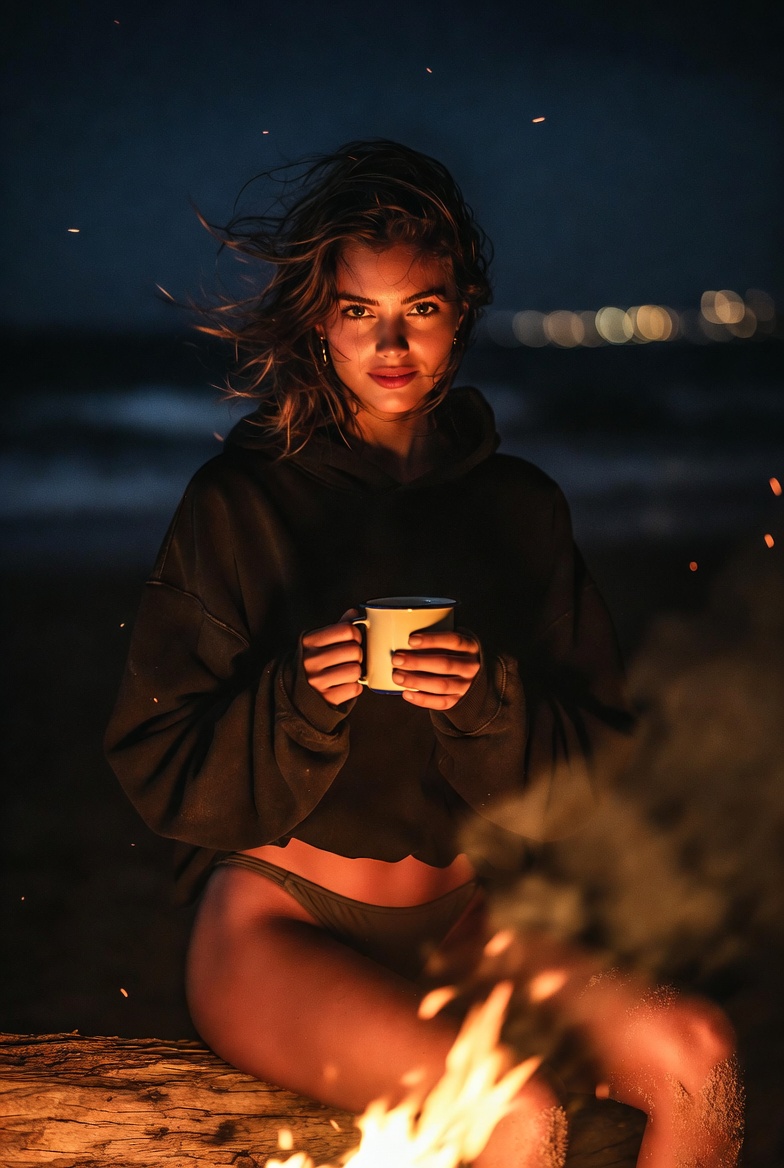 In the scene, a stunning young woman sits on a driftwood log close to the fire, angled three-quarters toward the camera. She’s relaxed but confident one knee drawn up slightly, one leg extended into the sand, toes dusted with tiny grains that catch the glow. The pose reads authentic because it’s functional: she’s close enough to feel the warmth, far enough to stay comfortable, and she’s holding a simple enamel mug (hot cocoa or tea) like she’s settling into the night. Her expression is the emotional hook soft smile, bright eyes reflecting the flames, the kind of look that feels like a private joke shared with the person behind the camera.
