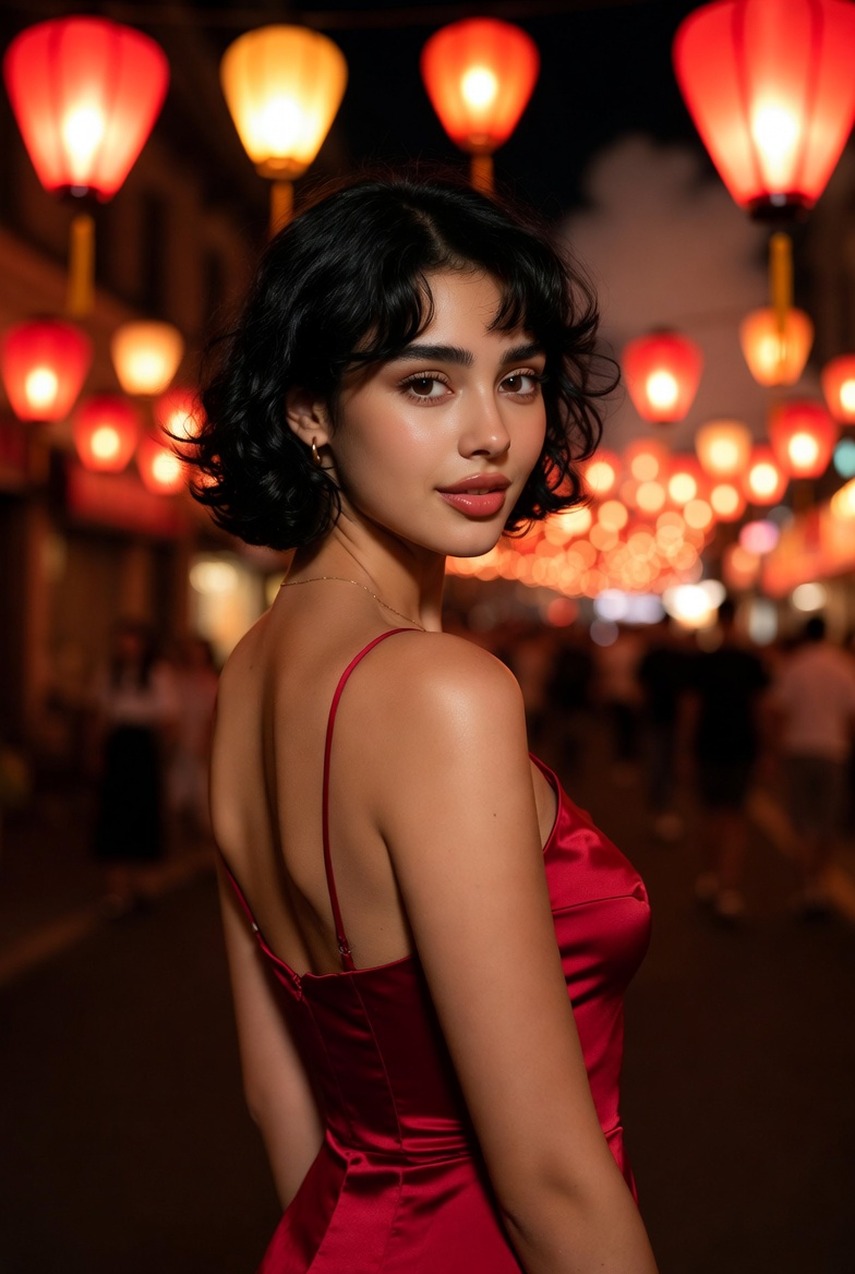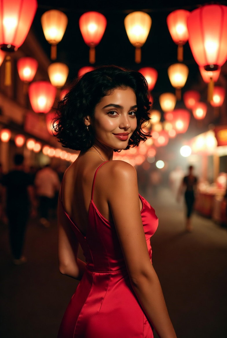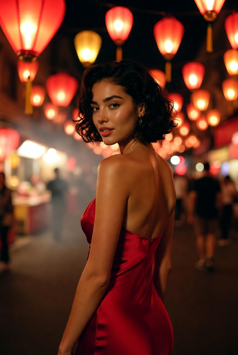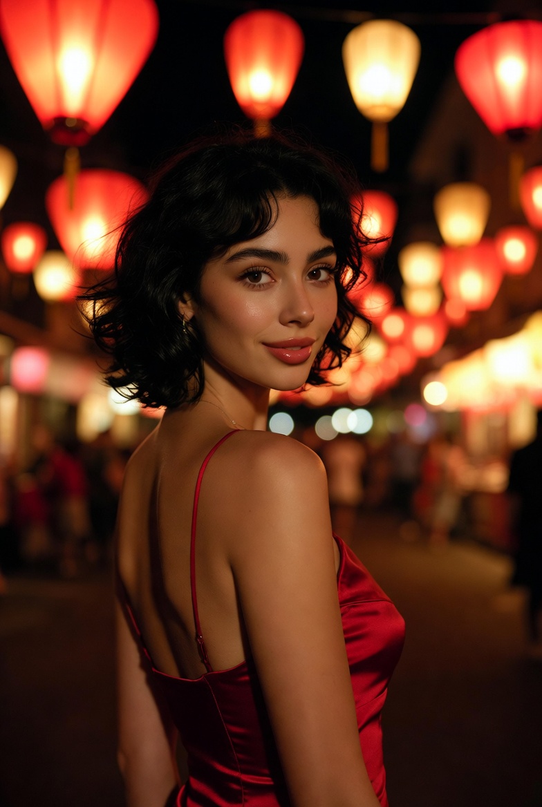 The mood here is confident, romantic, and lively like a candid street-style moment in the middle of a festival crowd. Instead of a static pose, the subject is walking forward through a lantern-lined alleyway and turning her head back toward the camera in an over-the-shoulder back-view moment. That single action is the secret sauce: it creates natural movement in hair and dress, makes the pose feel spontaneous, and gives the viewer a sense of “I’m being invited into this scene.” Her expression should be a soft, knowing smile bright eyes catching warm reflections like she just heard her name called behind her.