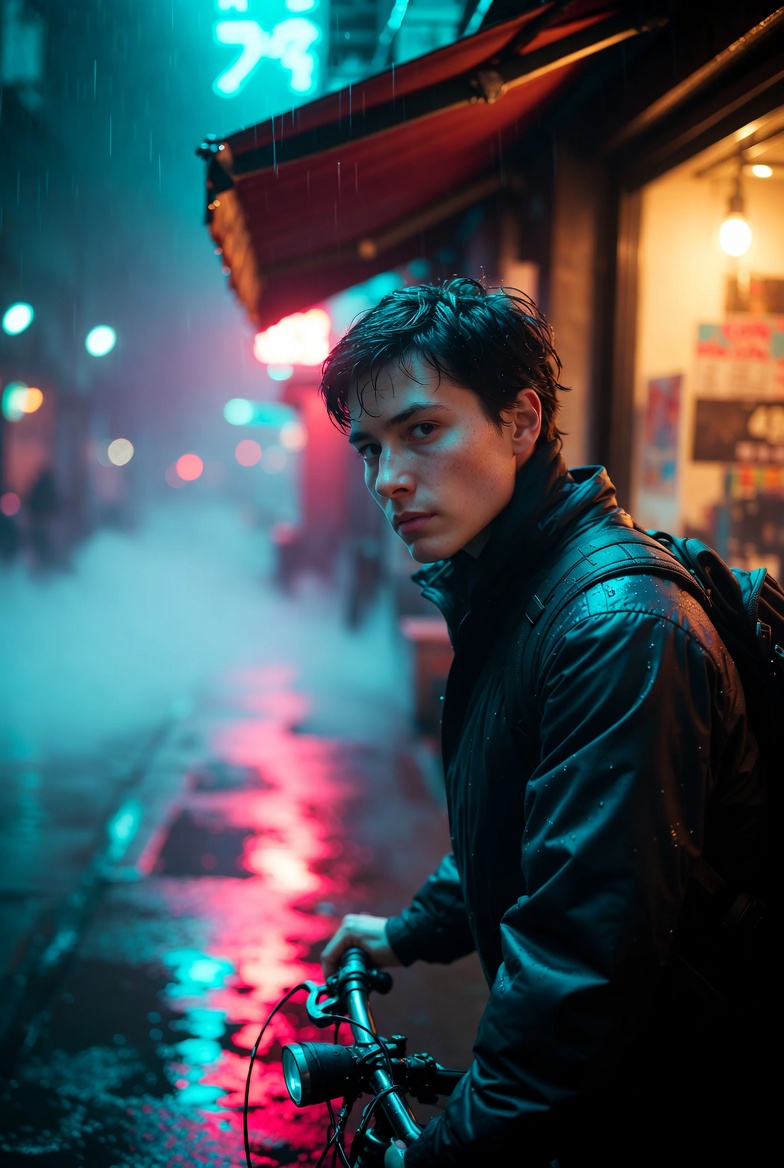 A night street portrait can feel instantly “movie-like” when you combine three ingredients: wet surfaces (for reflections), colored practical lights (for believable neon glow), and a lens choice that compresses the scene while keeping the subject sharp. This page is built around a cinematic street portrait prompt that’s designed to produce photorealistic results in Midjourney v6, Flux, and SDXL without relying on gimmicks. The concept: an adult urban cyclist taking shelter beneath an awning while rain turns the pavement into a mirror. The scene is modern, gritty, and grounded no fantasy props so it works for editorial-style portraits, brand imagery, social banners, and atmospheric profile shots.
