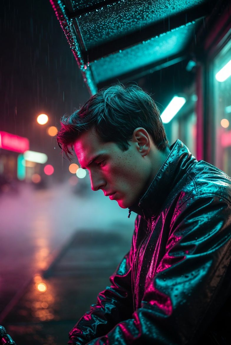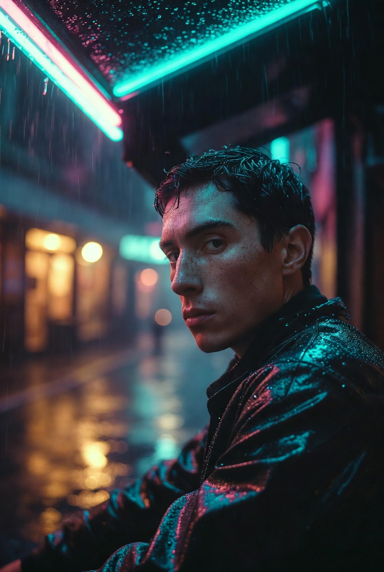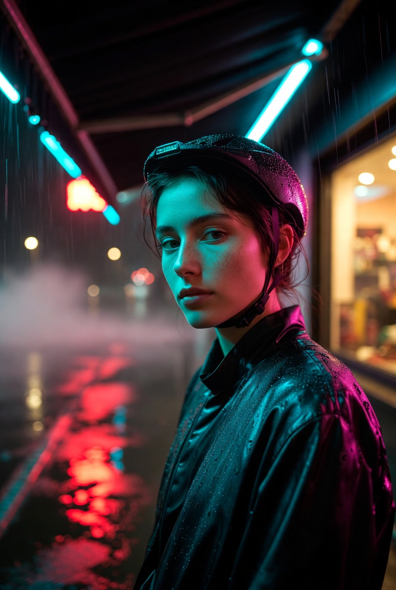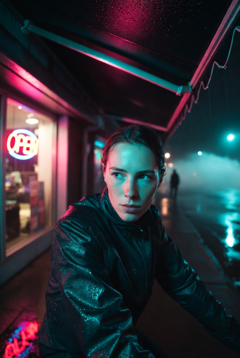 Visually, the “neon rain” setup gives you texture everywhere: micro-droplets on fabric, specular highlights on hair and jacket seams, and smeared reflections across the sidewalk. Those reflective surfaces are the secret to depth. Instead of a flat black background, you get layers: foreground shine, mid-ground subject, and a background haze where distant lights bloom into bokeh. That haze also helps hide clutter and creates a soft separation behind the face especially useful when the model tends to over-detail background objects.