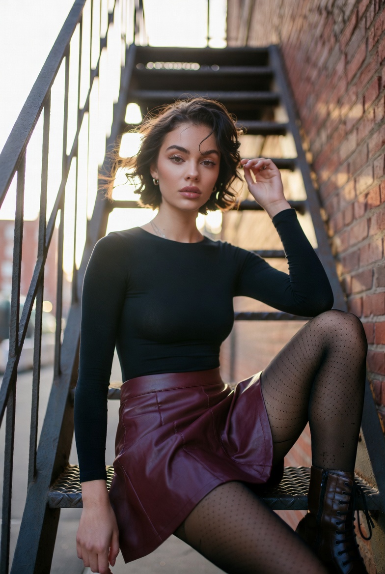 The 35mm lens is ideal for a fire escape because it captures enough environment rails, brick texture, and a hint of skyline without losing intimacy. The low angle adds presence and turns the staircase into a strong compositional frame, naturally leading the viewer’s eye upward toward her face. Color theory is doing quiet heavy lifting: burgundy leather harmonizes with warm brick and sunset gold, while black bodysuit and tights keep the silhouette sharp and modern. The Portra-style look helps the scene stay filmic: warm skin tones, controlled highlights on leather, and sunset gradients that feel real rather than oversaturated.