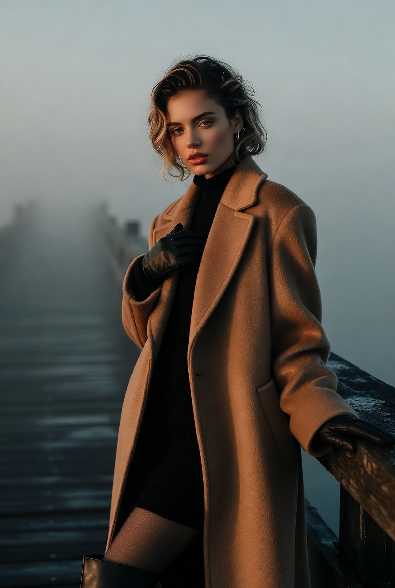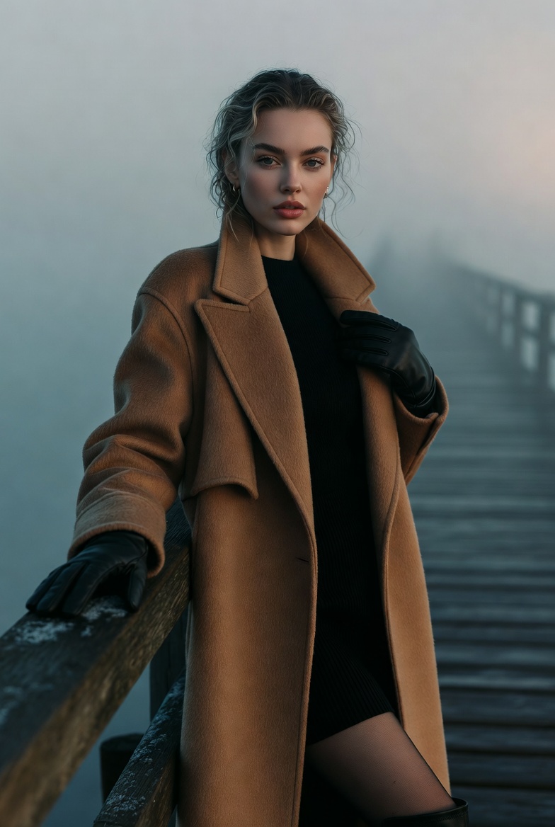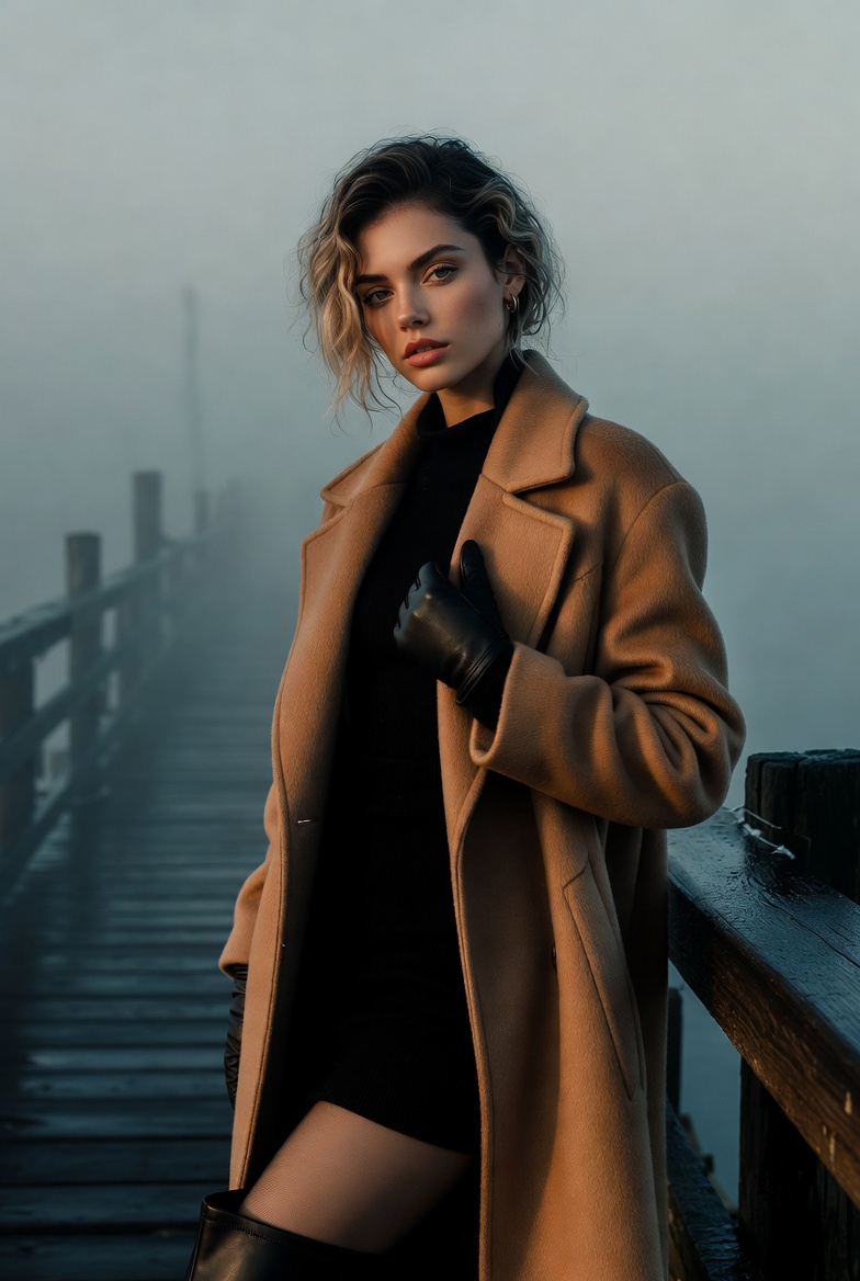 The setting does most of the storytelling. Weathered planks run in clean lines toward a vanishing point swallowed by fog. The water is barely visible, a smooth gray plane with faint ripples that catch the last traces of dawn. The air feels cold enough to justify layered fashion exactly what makes the outfit read believable. A long wool coat becomes the hero piece: structured shoulders, clean lapels, and subtle texture that shows up beautifully in photoreal rendering. It’s the kind of coat that suggests taste and intention without looking flashy. Underneath, a fitted black knit dress or turtleneck top keeps the palette minimal and high-end, while knee-high boots and leather gloves add sharp, tactile contrast.