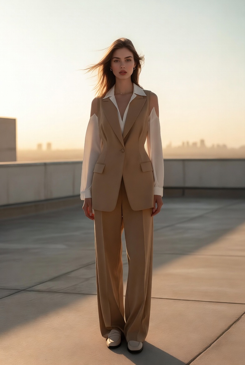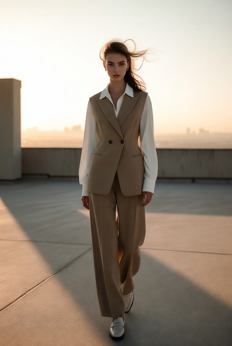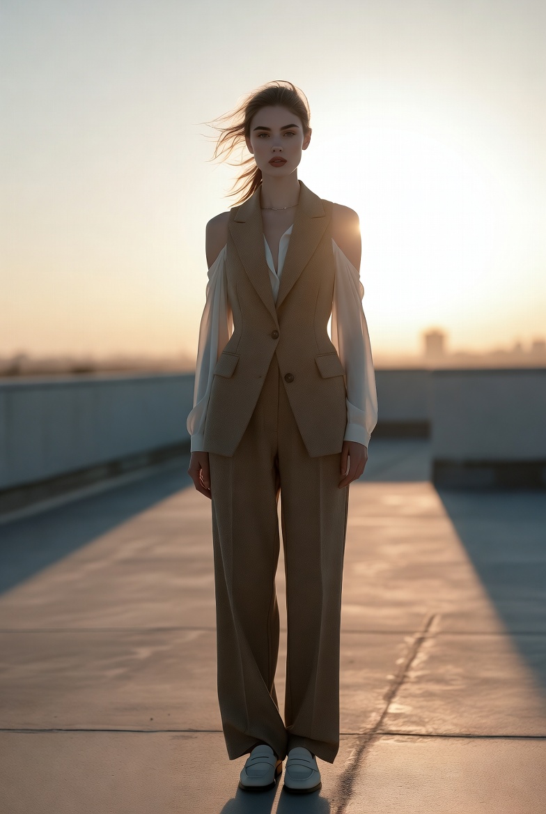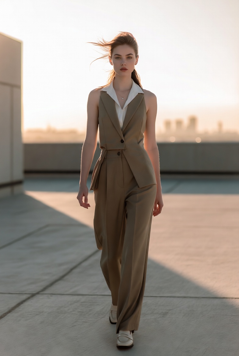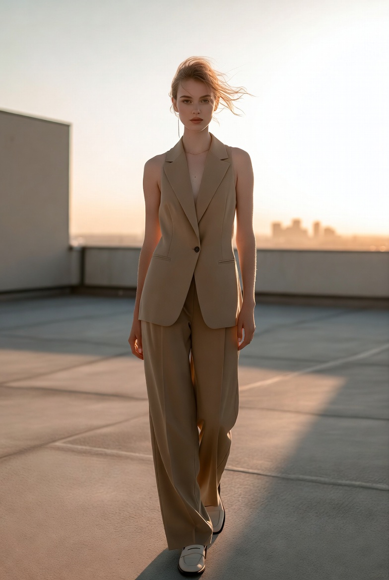 Wardrobe choice is where you keep the image professional and timeless. A tailored sleeveless vest paired with high-waisted trousers can look fashion-forward while staying modest and structured. Neutral tones sand, oat, stone pair beautifully with golden sunlight, keeping skin tones natural and preventing the scene from becoming overly saturated. Accessories should be minimal: a slim watch, small earrings, and maybe a delicate chain necklace that catches a single highlight. Hair should have a touch of movement nothing extreme just enough to suggest a breeze and add realism. The overall mood is confident and aspirational, like a luxury brand campaign that values calm power over drama.