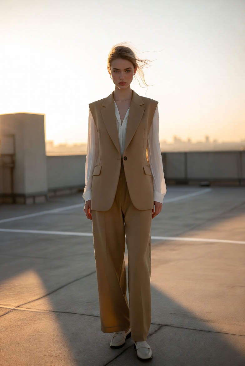 To create variations that still feel like the same shoot, keep the rooftop + golden-hour lighting locked and adjust styling in small, controlled ways. Swap the vest color to “stone gray” or “soft olive” for a new palette that still harmonizes with warm sun. Replace loafers with “minimal white sneakers” for a modern street-editorial feel, or change the blouse to “light knit turtleneck” for a cooler-season campaign look. If you want stronger cinematic mood, add “slightly lifted blacks, subtle film grain,” but avoid pushing saturation too hard golden hour can quickly become orange.