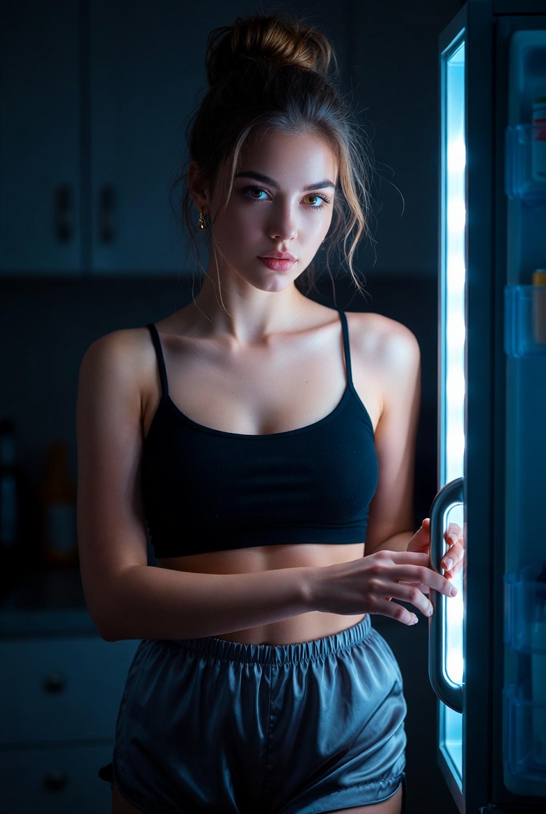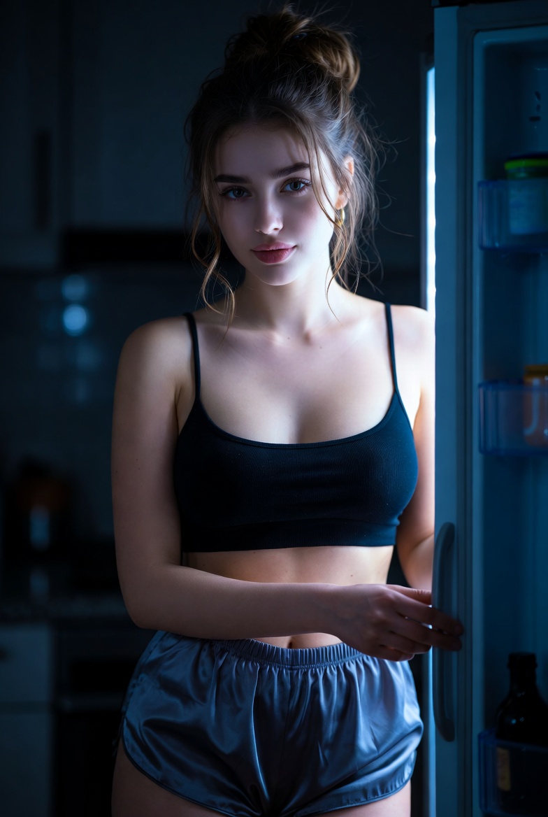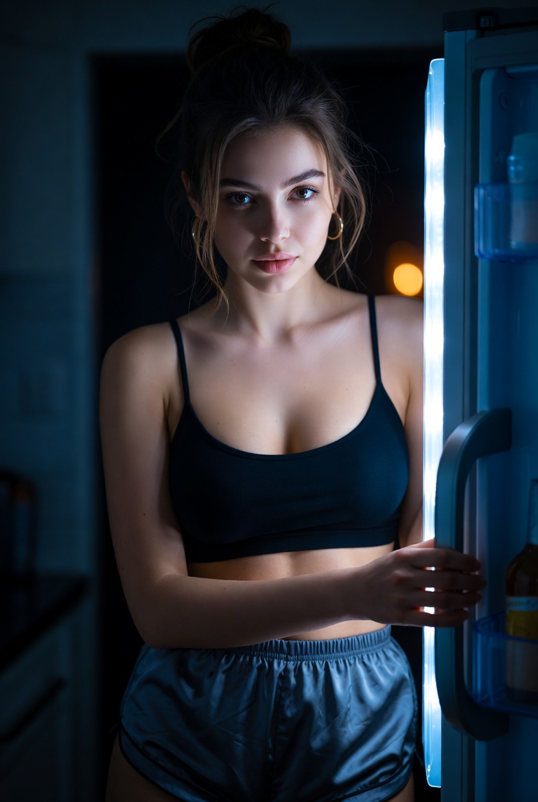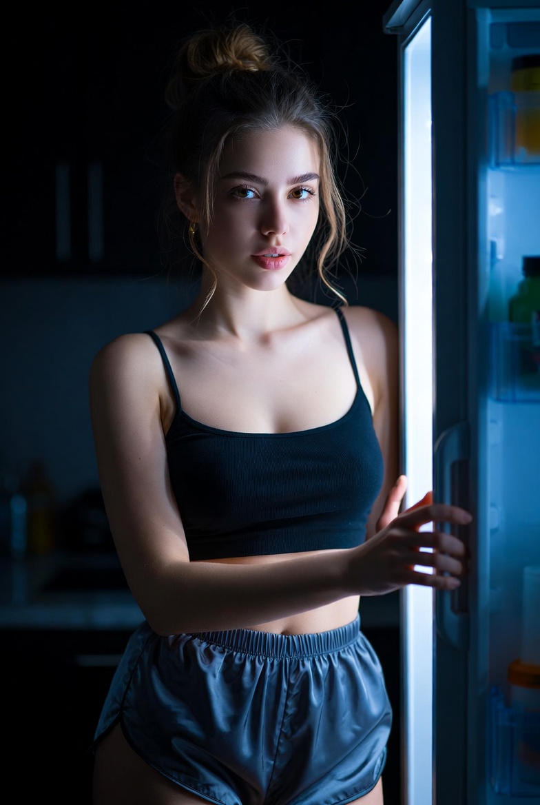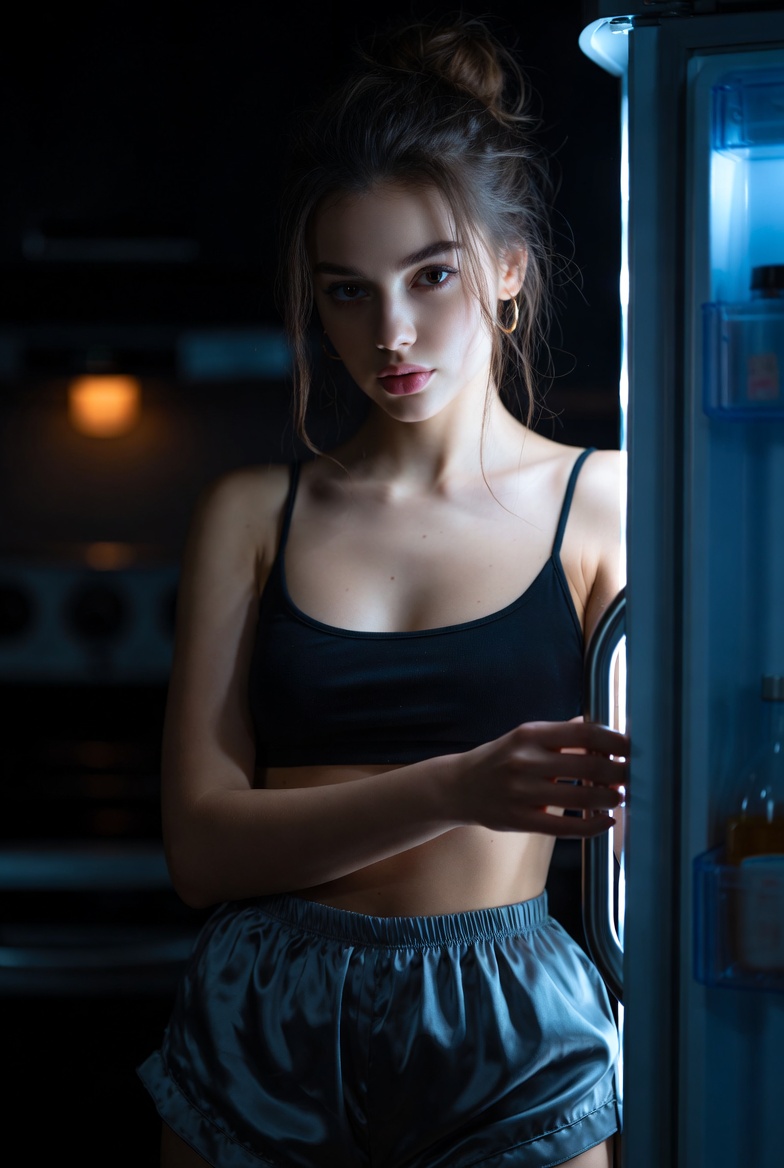 Styling stays true to the setting: silk pajama shorts and a cropped top are realistic for late-night at home, but they also photograph beautifully. Silk catches the fridge glow with clean specular highlights and gentle folds, while the crop top keeps the silhouette modern and uncluttered. Add one tiny “quiet luxury” detail small gold hoops, or a delicate necklace that glints subtly so it still feels editorial without breaking the cozy vibe. The pose stays grounded: one hand on the fridge handle, the other lightly holding a small snack container or resting on the door edge. This keeps hands natural and gives the generator clear instructions for anatomy (a common failure point).