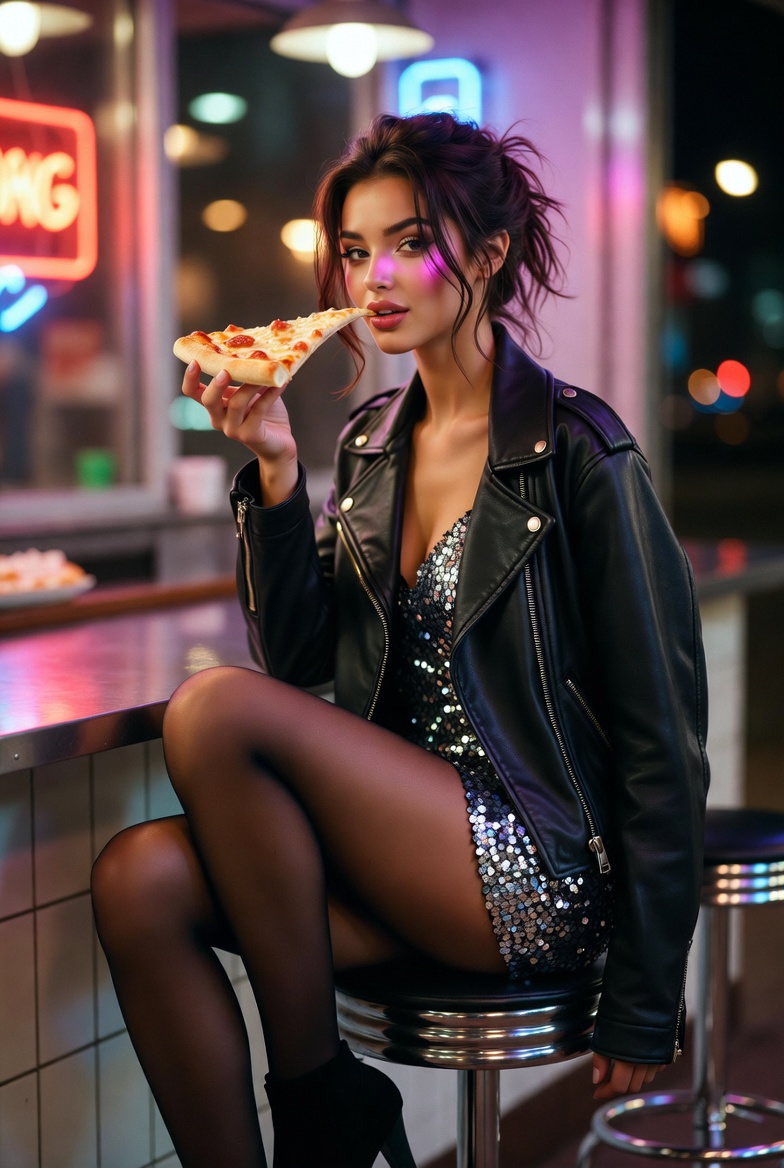 Late Night Pizza ShopPrompt: Neon Pizza Shop Glam Leather Jacket Over Party Dress (Photoreal 8K)Late Night Pizza Shop
