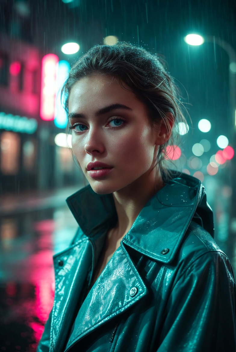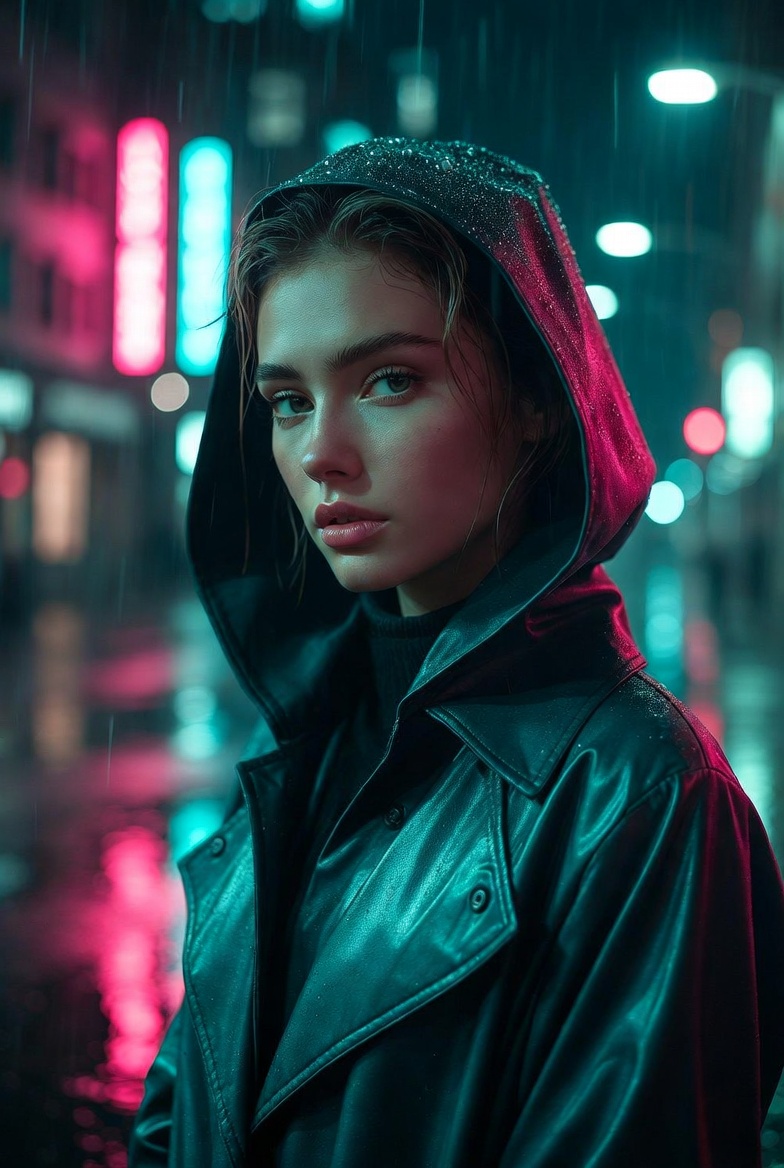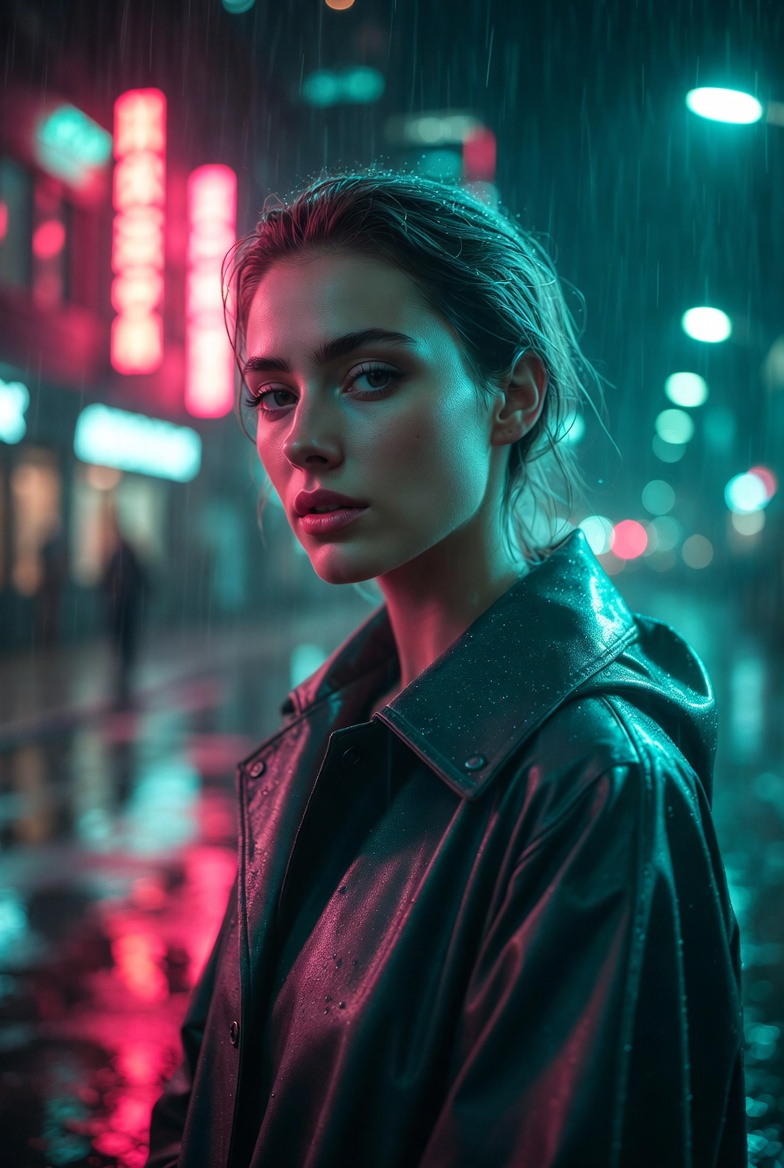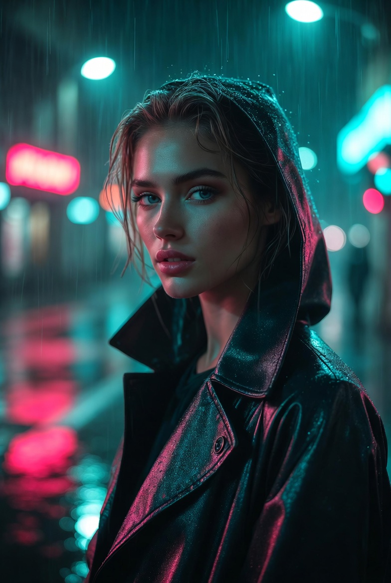The key to making neon rain work is describing how the environment behaves. Wet streets amplify color, creating mirror-like reflections that instantly signal realism when done right. Soft rain and mist catch light in the air, adding dimensionality and separating foreground from background. When you pair that with shallow depth of field and practical lights behind the subject, you get a natural sense of scale like the city continues beyond the frame. The subject should read as elegant and composed: modern rainwear, understated styling, and a calm expression that communicates confidence without leaning into anything suggestive.
