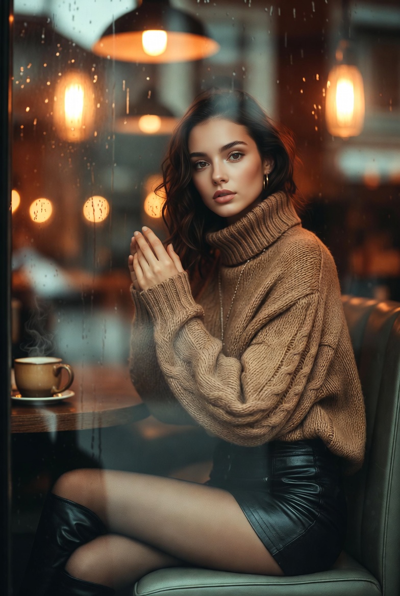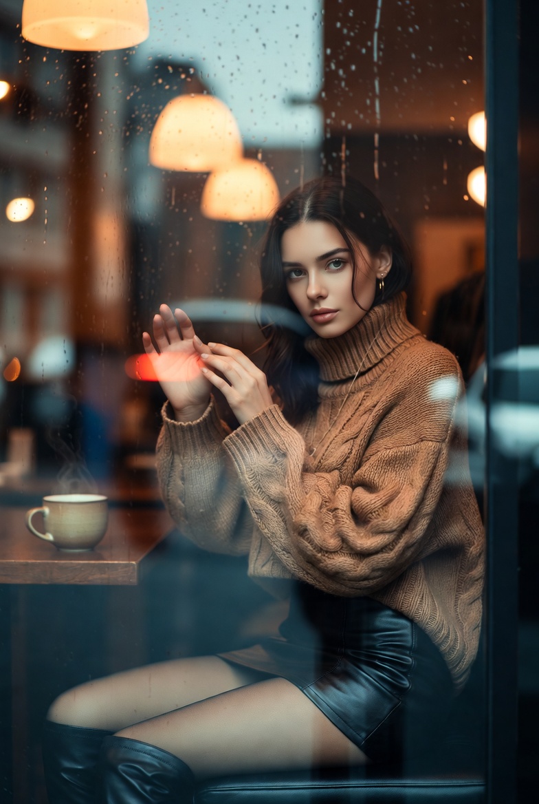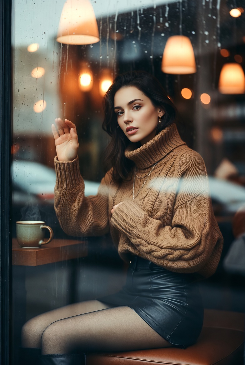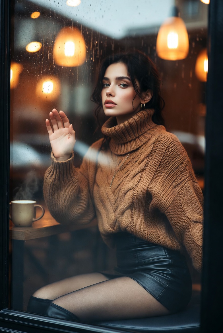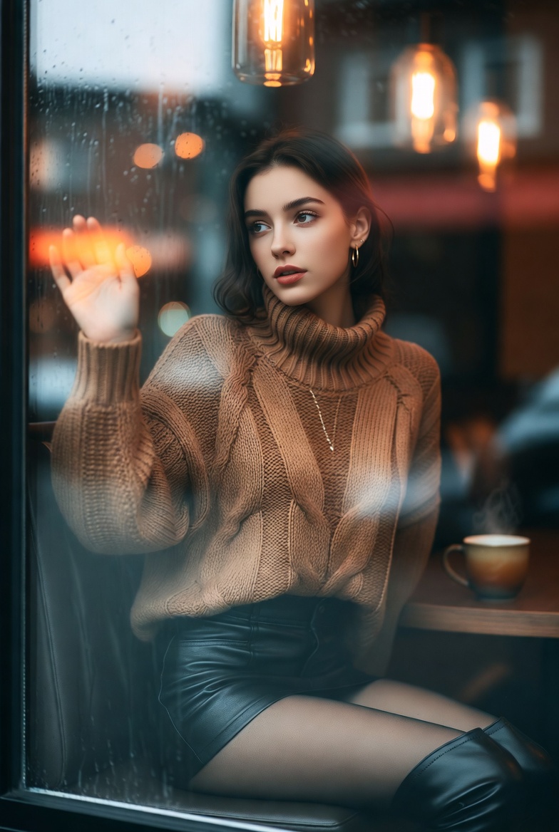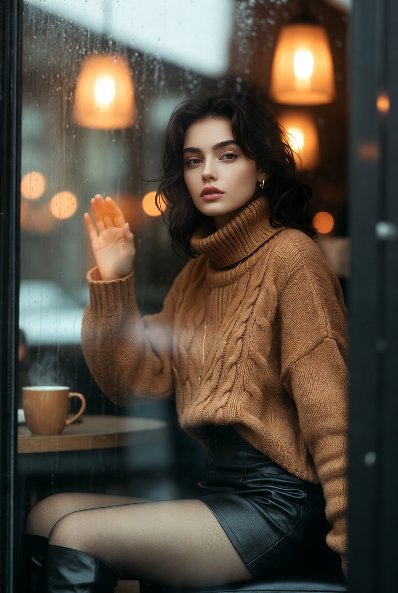 Stunning young woman sitting by a rainy cafe window with her hand on the glass, wearing a cozy turtleneck sweater and leather mini skirt, cinematic 8K reflections