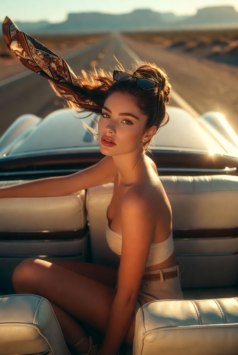 Our subject is a stunning young woman in her early 20s, perched casually on the rear bench of a vintage convertible. She’s angled diagonally across the seat one knee bent, the other leg extended in a relaxed line so the composition feels dynamic without looking posed. Wind is the star here. Her hair lifts and fans out naturally, catching warm highlights strand by strand. A lightweight silk scarf is tied at her ponytail and trails behind her like a brushstroke, creating movement that reads instantly even as a thumbnail. That scarf trail is the “viral detail”: it transforms the frame from a simple travel photo into a mini movie still.