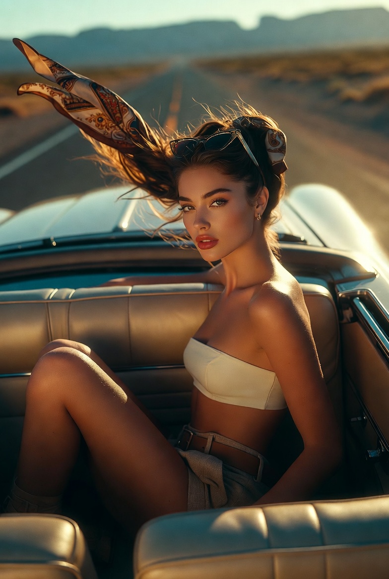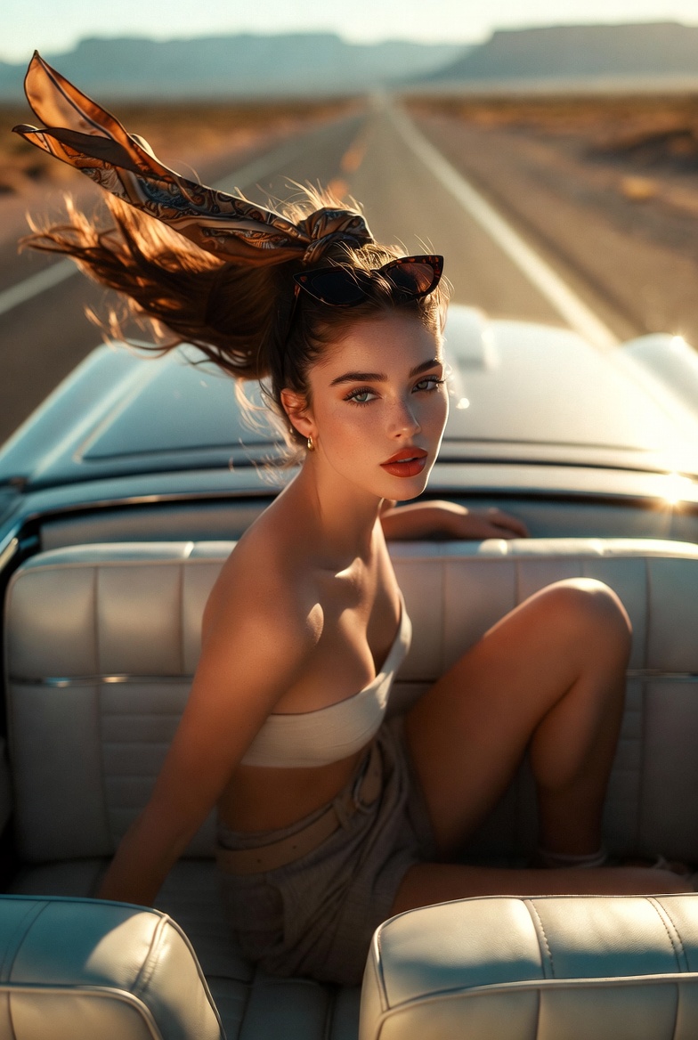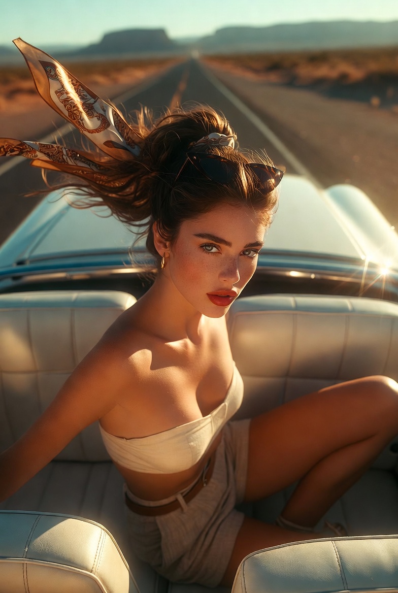 Some images don’t just show an outfit they sell a feeling. This one is all about the open-road fantasy: sun-warmed leather seats, chrome details flashing like tiny stars, and a ribbon of highway cutting through a desert horizon. The Route 66 vibe works because it’s both nostalgic and modern: vintage aesthetics, but captured with crisp, photoreal clarity that feels made for today’s feed. Instead of the usual “driver’s seat portrait,” the shot flips the perspective into something instantly scroll-stopping: a top-down view from above the back seats, as if a drone or overhead rig caught the most cinematic second of the drive.