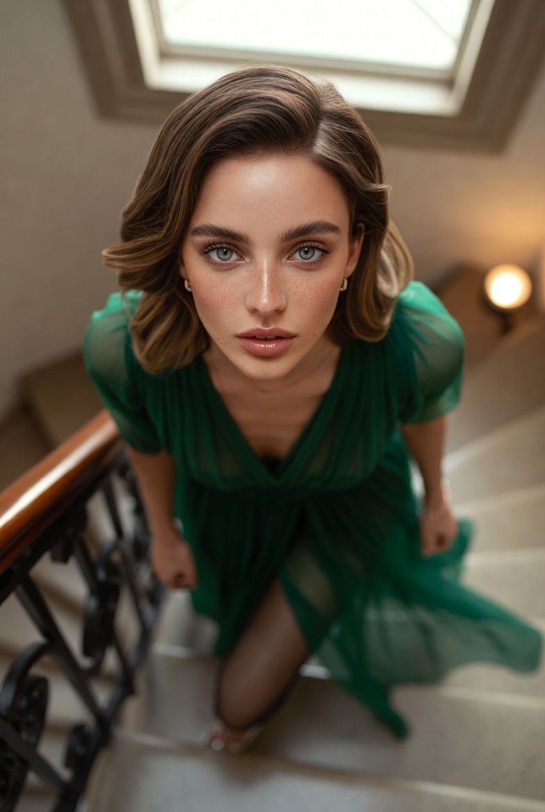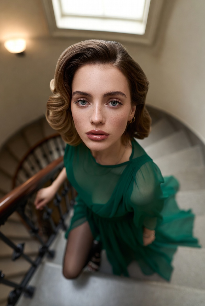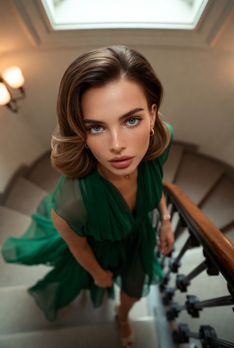 The mood here is confident, elegant, and slightly mysterious like a fashion editorial caught mid-transition. The key is the high-angle top-down perspective: the camera looks straight down from the upper landing, and the subject looks up into the lens. That eye contact flips the power dynamic in a fun way. Even though the camera is above, her gaze pulls you in, creating instant connection. The expression should feel composed and self-possessed soft lips, relaxed brow, bright eyes more “quiet authority” than exaggerated drama. A small detail like her fingertips grazing the railing makes the moment feel real, like she’s paused for one breath before continuing down the stairs.