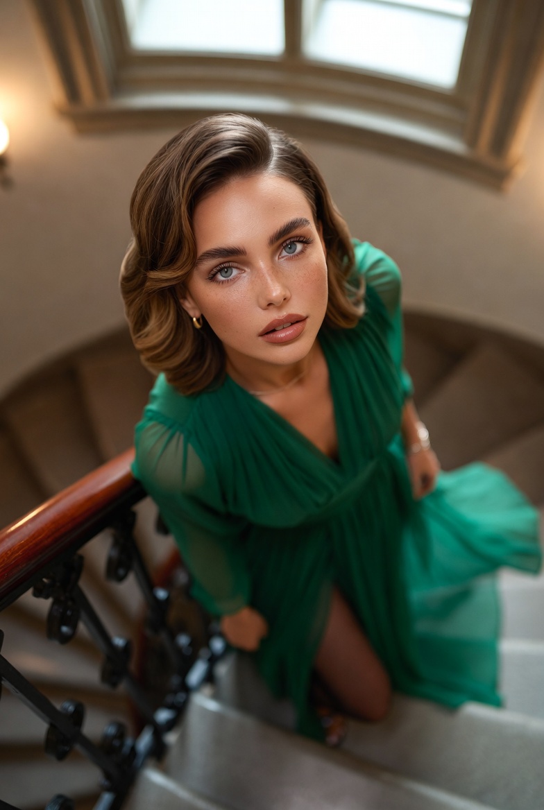 A 35mm lens is ideal for showing the staircase geometry without extreme distortion, and f/2.0 provides separation while keeping enough architectural detail to sell the spiral. The high-angle viewpoint turns the location into a graphic design element, while her upward gaze creates emotional focus. Color theory is simple and strong: emerald against neutral stone/iron feels premium and editorial, and Portra-style rendering helps skin stay warm and lifelike even in mixed interior light, while preserving highlight detail on chiffon folds and metal railing reflections.