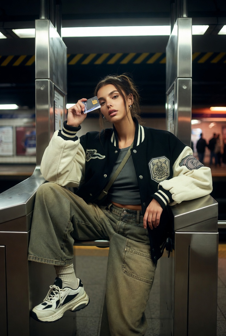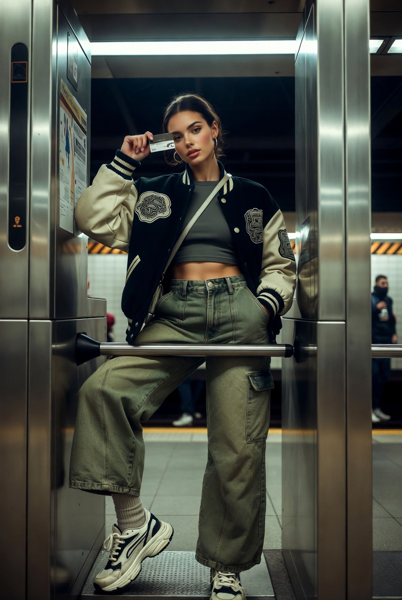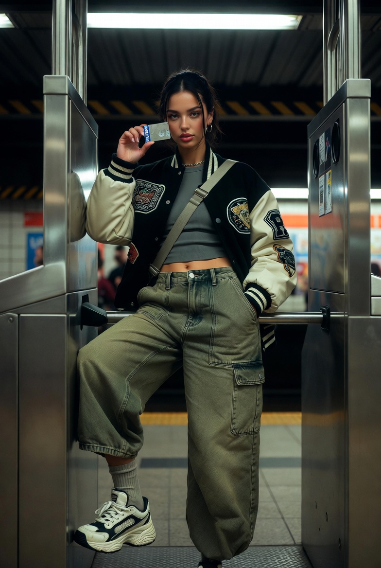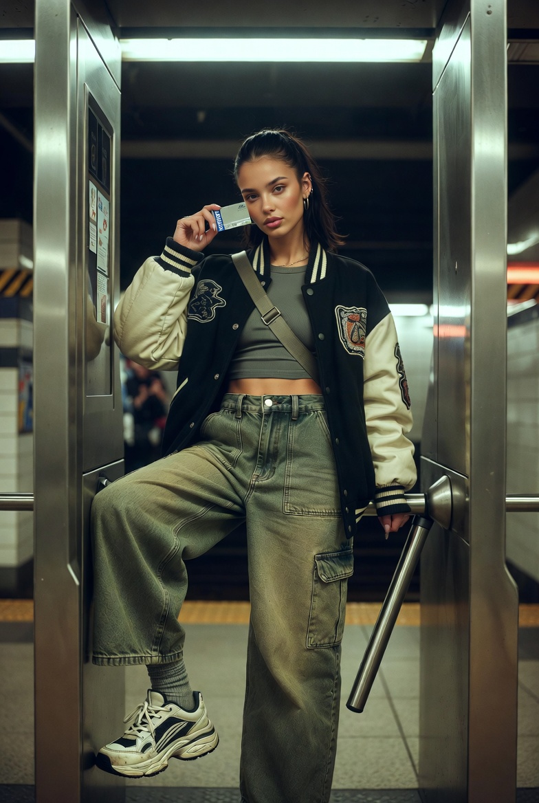 The outfit is pure modern streetwear structured enough to photograph sharply, comfortable enough to make sense underground. A slightly oversized varsity jacket is the hero: bold patches, ribbed cuffs, and that matte-wool texture that looks expensive under harsh station lighting. Underneath, a fitted cropped tank keeps the silhouette clean without overcomplicating the frame. Instead of repeating the usual mini skirt trope, she wears high-waisted wide-leg cargo pants with crisp stitching, roomy pockets, and realistic creases at the knees giving the look movement and authenticity. Chunky sneakers ground the styling (and the scene), while small details sell the realism: a crossbody bag strap across her torso, a simple chain necklace catching tiny highlights, and a glossy manicure that pops against the metro card.